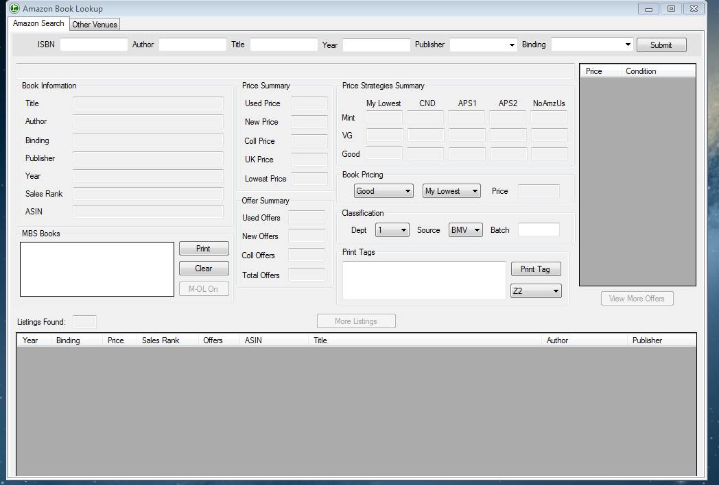 The goal of this program was to efficiently look up and determine if a book should be posted on Amazon using various pricing strategies. I developed this program to improve my data entry performance at a previous job. The program was written in C# and integrated apis from Amazon, Ebay, Alibris, AbeBooks, and Half.com.